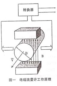 如圖一,當導電流體以平均流速V(m/s)通過裝有一對測量電極的一根內徑為D(m)的絕緣導管內流動時,該管道處于一個均勻的磁感應強度為B(T)的磁場中,那么在一對電極上就會產生感應電動勢E(V),它的方向垂直于磁場和流體的方向。