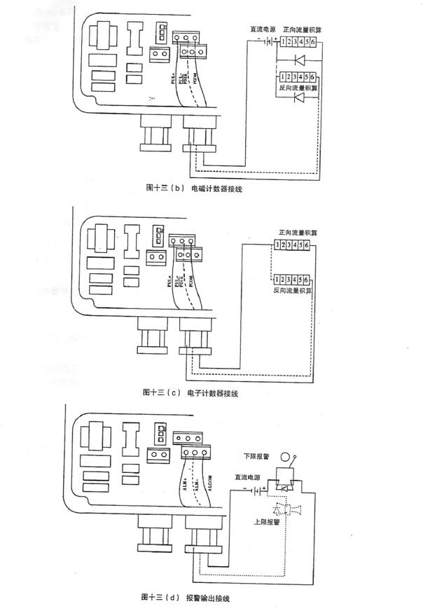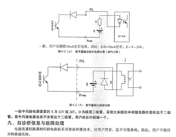 報警輸出:兩路帶光電隔離的晶體管集電極開路報警輸出。外接電源不大于35V,導通時集電極最大電流為250mA。報警狀態:流體空管、勵磁斷線、流量超限。